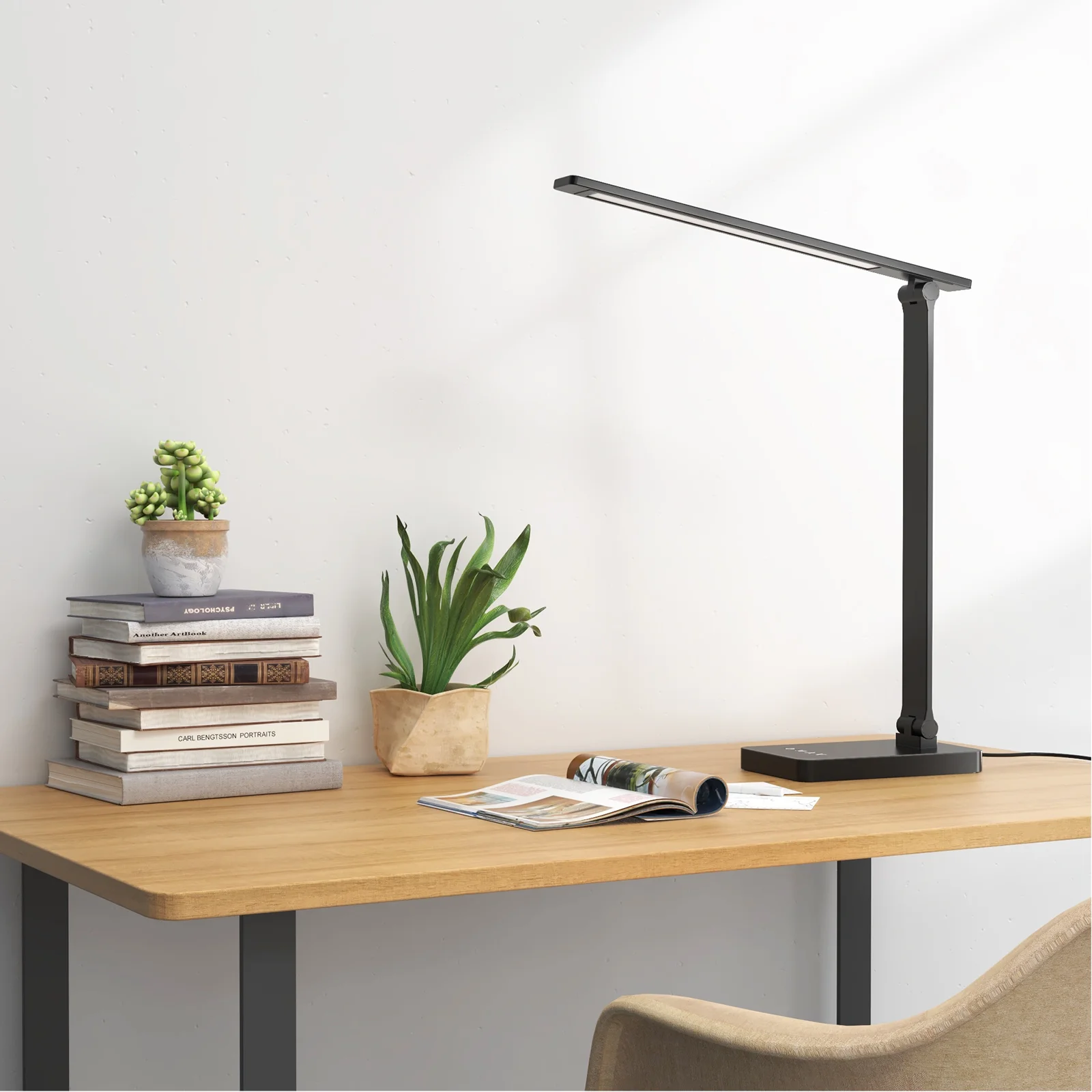 • Integrated LED provides warm light. • Touch controls adjust brightness. • Weighted base for stability. • No bulb changes needed. • Neutral finish suits most spaces.